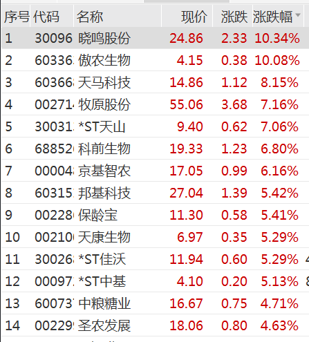 猪肉、鸡肉等板块今日表现也比较强势,晓鸣股份大涨超10%,傲农生物(维权)涨停,牧原股份涨超7%,天康生物等多股大涨。